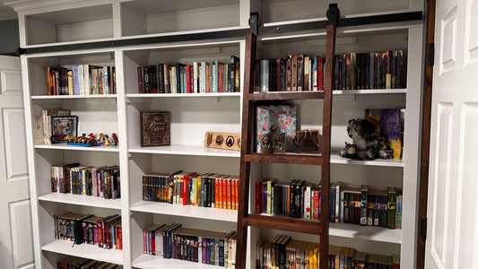 8ft Tall Luxurious Bookcase with Walnut and Epoxy Rolling Ladder and Crown Molding
